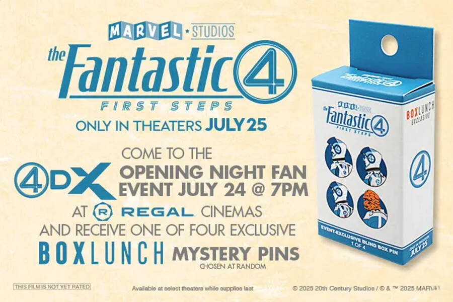 Attend the Opening Night Fan Event Screening of The Fantastic Four: First Steps at Regal Cinemas, and receive one of four exclusive Box Lunch Mystery Pins, while supplies last.