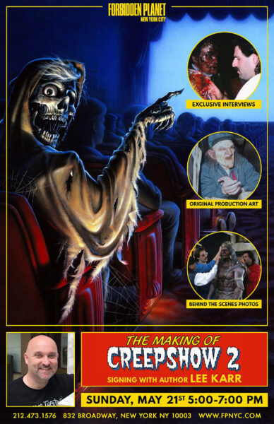 On May 21st from 5PM to 7PM, Forbidden Planet New York City hosts an in-store signing event to celebrate the release of the book The Making of Creepshow 2 with author Lee Karr. Also attending the signing is the movie’s director of photography Tom Hurwitz, set decorator Andrew Bernard, and New World Pictures publicity and promotions executive Lori Koonin Schneider.