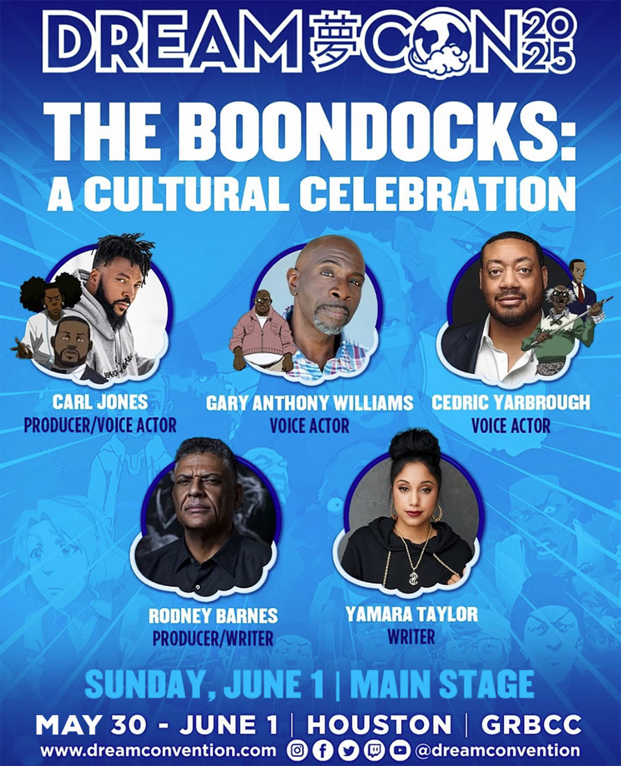 The Boondocks: A Cultural Celebration panel discussion takes place on Sunday, June 1, 2025 on the Dream Con Main Stage. The panel includes Producer & Voice Actor Carl Jones, Voice Actor Gary Anthony Williams, Voice Actor Cedric Yarbrough, Producer & Writer Rodney Barnes, and Writer Yamara Taylor.