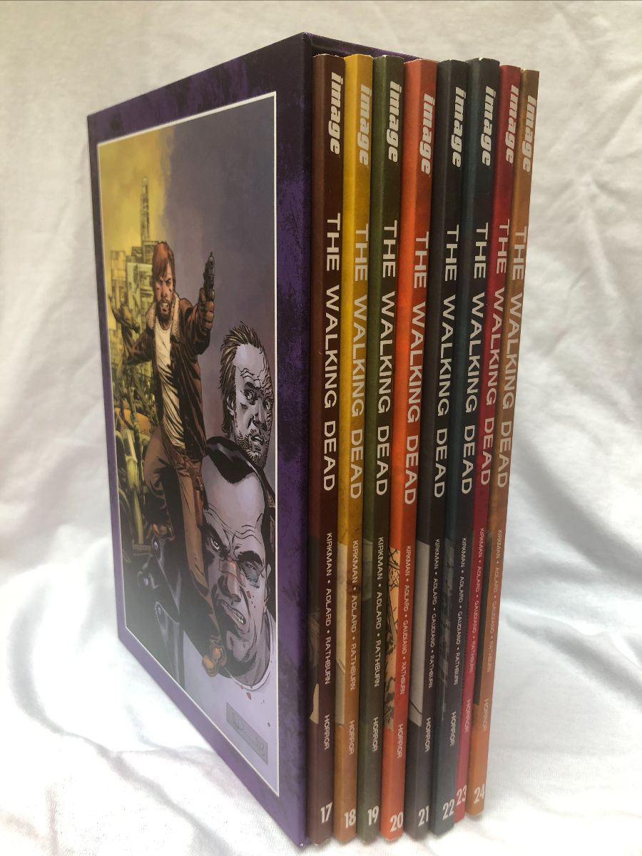 The Walking Dead 20th Anniversary Box Set #1 includes volumes 1-8 (featuring art by Tony Moore and Charlie Adlard), The Walking Dead 20th Anniversary Box Set #2 includes volumes 9-16 (featuring art by Charlie Adlard), The Walking Dead 20th Anniversary Box Set #3 includes volumes 17-24 (featuring art by Charlie Adlard), and The Walking Dead 20th Anniversary Box Set #4 (featuring art by Charlie Adlard) includes volumes 25-32.