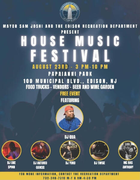 Edison Township hosts its 3rd annual House Music Festival at Papaianni Park in Edison, New Jersey. The event includes food trucks, vendors and a beer & wine garden. Featured DJs include DJ Qua, DJ One Spinn, DJ Antonio Garcia, DJ Yuko, DJ Twise and MC Ras Anthony.