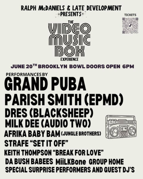 Ralph McDaniels and Late Development present The Video Music Box Experience, a classic hip hop concert that takes place at Brooklyn Bowl, located on Wythe Avenue in Brooklyn, New York. Performers for the event include Grand Pupa (Brand Nubian), Parish Smith (EPMD), Dres (Black Sheep), Afrika Baby Bam (The Jungle Brothers), Milk Dee (Audio Two), Strafe (known for “Set It Off”), Keith Thompson (known for the Raze single “Break 4 Love”), Da Bush Babies, Miilkbone, Group Home and more special guests and DJs.